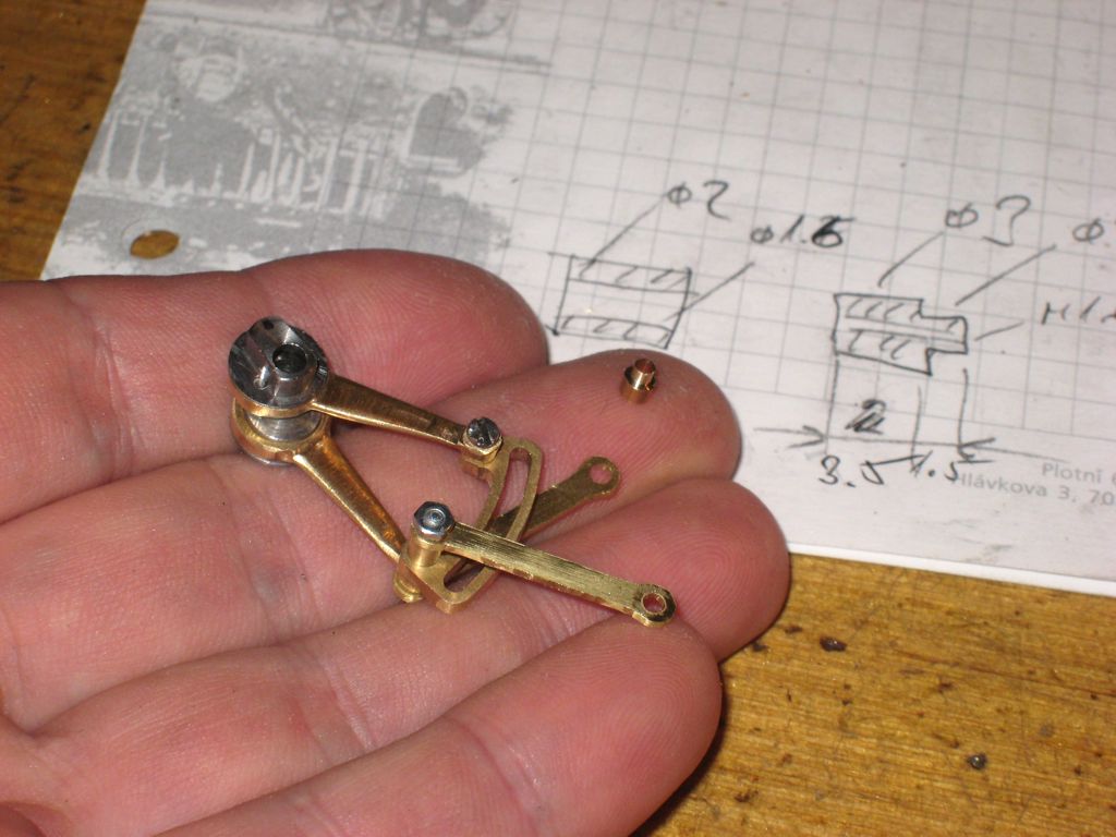Kulisa s výstředníky. Některé součásti jsou opravdu mrňavé - např. distanční vložka na konci prstu.