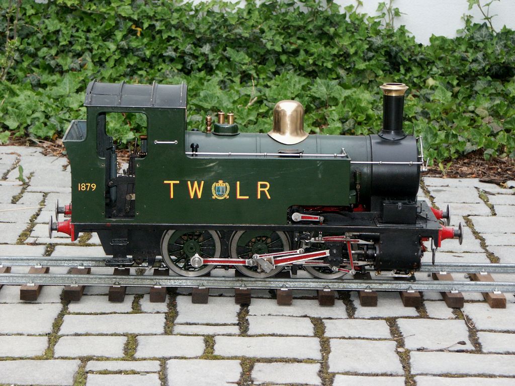 Anglická krasavice z boku. Topí se uhlím (jak jinak v této velikosti), provozní tlak 6 atmosfér, písty 1.25 palce, vnější Heusingerův rozvod.